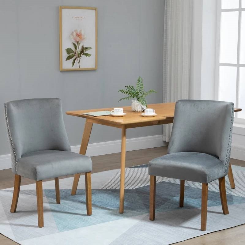 Create a stylish and cozy dining area with this Grey Modern High Back Nail Head Trim Upholstered Dining Chairs, Set of 2! Includes 2 chairs that can be used for having dinner, a conversation for two or accent chairs in your home. Chairs include a high backrest and wood legs for a modern and contemporary design that complements your home décor. Use in the kitchen, dining room, bedroom, office, and more. Sit back and sink into these upholstered accent chairs! The chairs covered with velvet-touch polyester fabric offer good breathability. Includes a high back and a sponge padding seat for added comfort and support while you lounge. The dining room chairs are suitable for daily use. All four legs are made with solid wood construction for a stable seating area.
